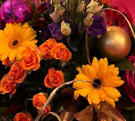 A beautiful mix of oranges, yellows, bright pinks and purples, with gold accents and seasonal foliage. Including bright baubles, cinnamon sticks and a pine cone, giving our basket that festive feeling!