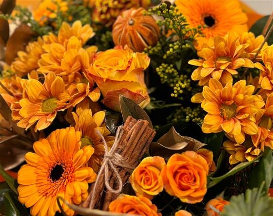 A beautiful mix of oranges with seasonal foliage and a splash of gold. Including a dried orange, cinnamon sticks and a pine cone, arranged in a basket with a bow, giving our basket that festive feeling!