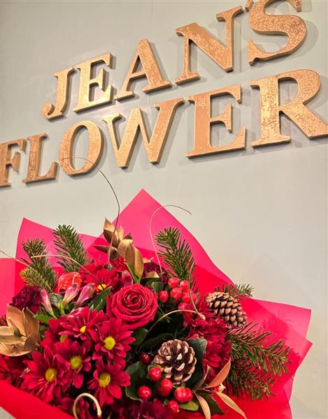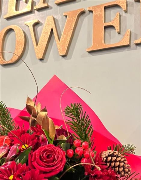 A beautiful mixed hand-tied bouquet of reds with gold accents, and of course seasonal foliage. Including a gold glittered red rose as the feature bloom, with cinnamon sticks and pine cones, giving our bouquet that festive feeling!