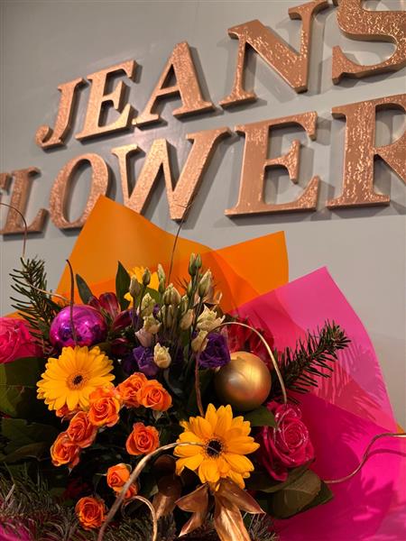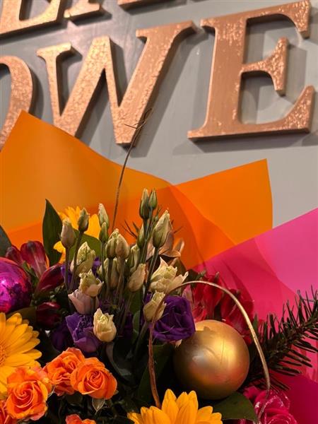 A beautiful mixed hand-tied bouquet of oranges, yellows, bright pinks and purples, with gold accents and seasonal foliage. Including bright baubles, cinnamon sticks and a pine cone, giving our bouquet that festive feeling!