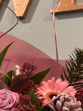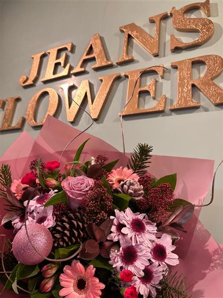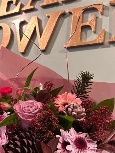 A beautiful mixed hand-tied bouquet of pale and bright pinks, with tonal purples and seasonal foliage. Including a sparkly bauble, rose gold decorations and a pine cone, giving our bouquet that festive feeling!