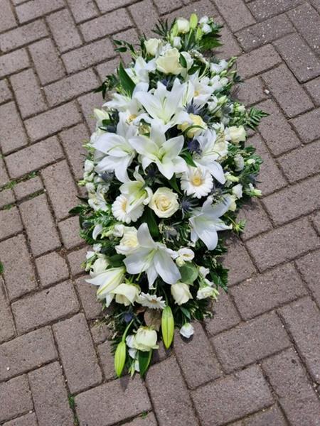 A classic all white spray includes oriental lilies and roses along with a beautiful mix of co-ordinating blooms.