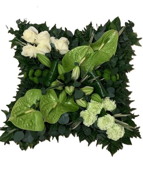 A contemporary sectioned square cushion tribute with a variegated foliage base.