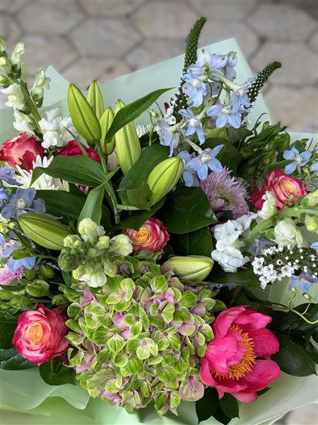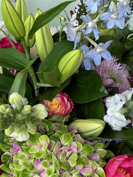 A truly extravagant selection of colourful seasonal blooms in pinks, blues, whites and lilacs in an explosion of colour!