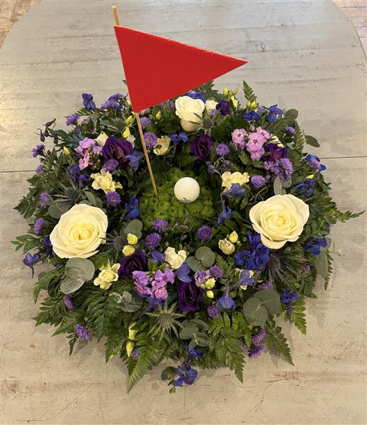 Posy tribute with massed green chrysanthemums for central green and golf ball with flag, surrounded by a selection of blooms in your choice of colours.