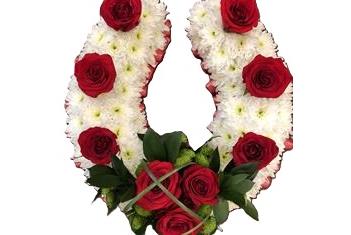 Massed horseshoe with ribbon edge and roses in a choice of colours.
