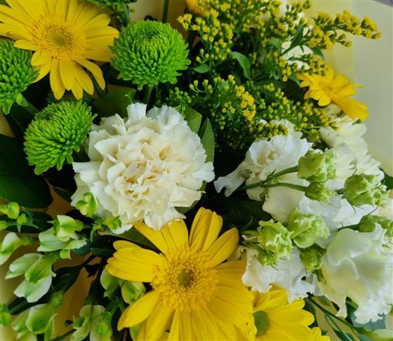 A zingy combination of seasonal lemons, yellows and limes, with a touch of white, this bouquet is inspired by hot summer days and refreshing cool drinks!
