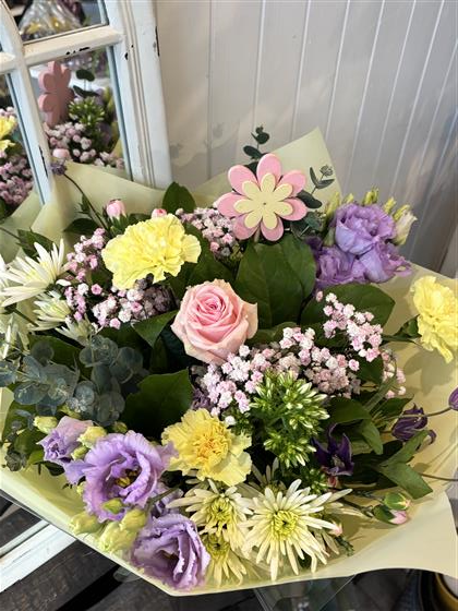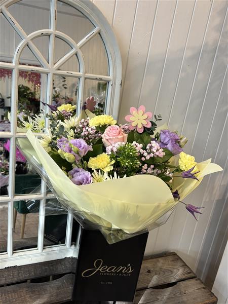 This design is hand-tied in spiral form, and features favourites such as gypsohila, lisianthus, carnations, clematis, spray roses, chrysanthemums, trachelium and fresh seasonal foliage including eucalyptus, to compliment the overall aesthetics.