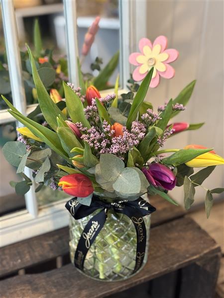 Please note that due to the seasonal availability of flowers it may be necessary to vary individual stems from those shown. Our skilled florists may substitute flowers for one similar in style, quality and value. Where our designs include a sundry item like a vase or basket it may not always be possible to include the exact item as displayed. If such an occasion arises we will make every effort to replace the item with a suitable alternative.