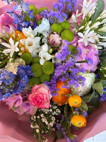 A truly opulent selection of colourful blooms in pinks, blues, whites, oranges yellows, greens and lilac's in an explosion of colour!