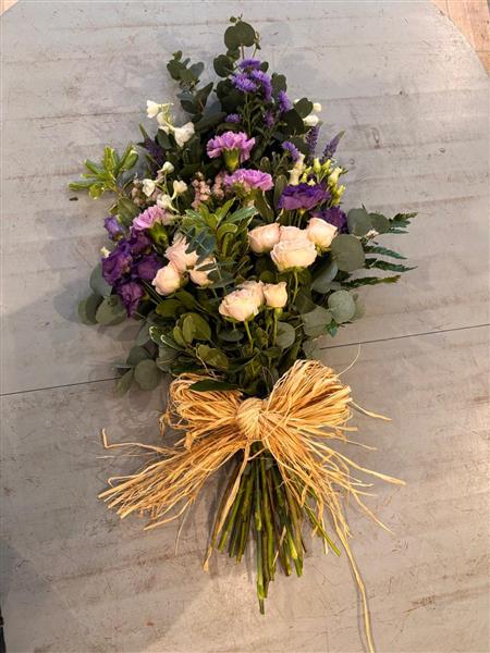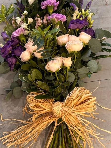 A beautiful selection of pink and purple flowers, with accent of white and a variety of fresh seasonal foliage.