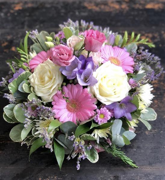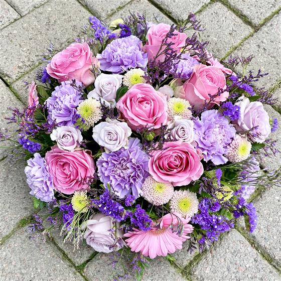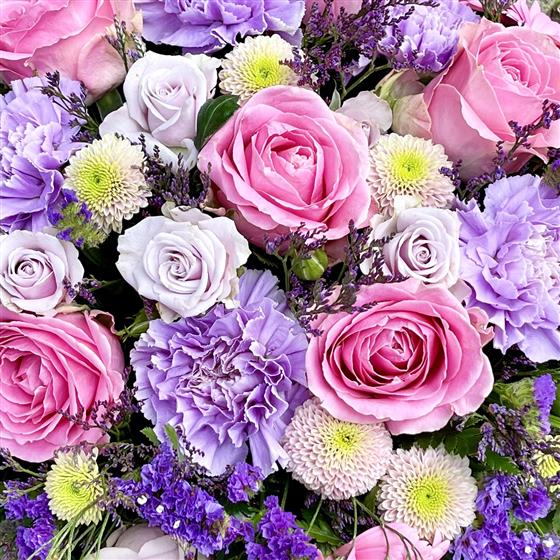 A beautiful selection of fresh blooms in a complementary collection of pinks, purples, lilacs and creams, with fresh seasonal foliage.