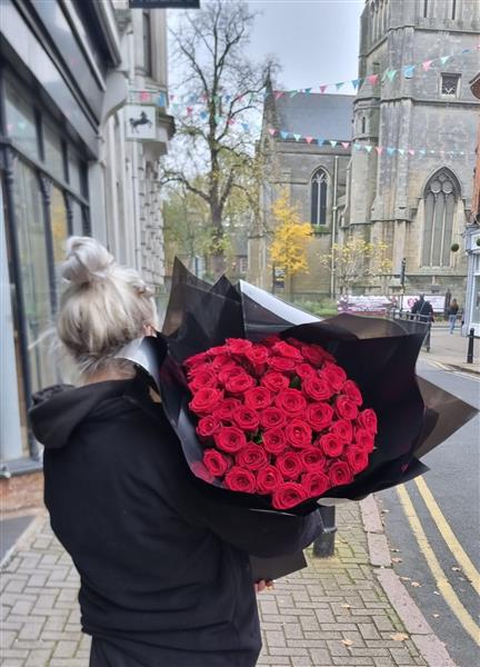 The best quality roses beautifully arranged in spiral form, incorporating a variety of fresh green seasonal foliage.