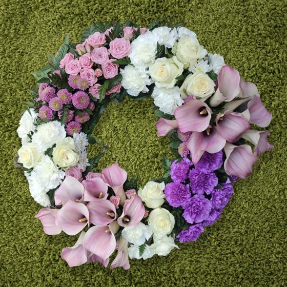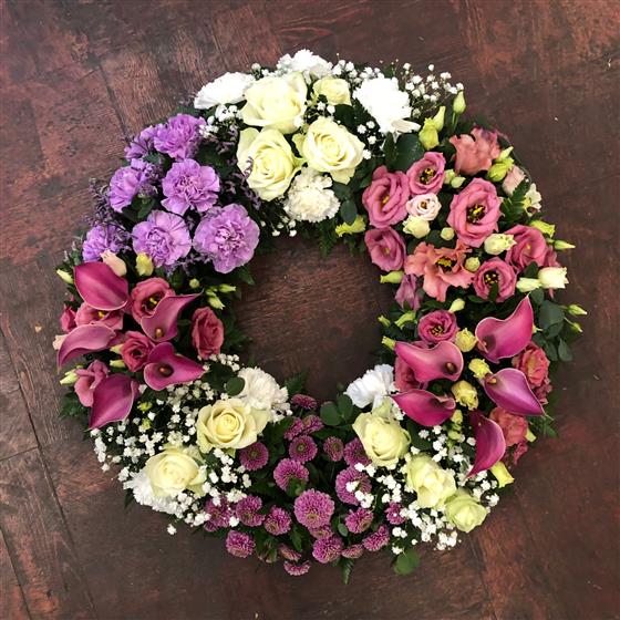 An unusual wreath of grouped flowers giving a bold statement look, including a variety of classics and seasonal favourites.