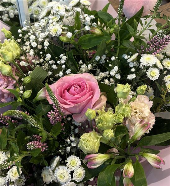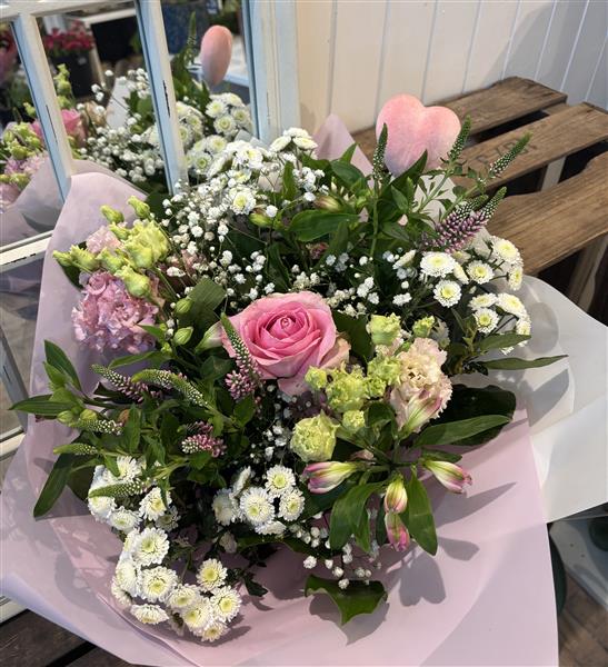 A single top quality, luxury pink Ecuadorian rose, that are known for their larger heads and longer vase life, is beautifully accompanied by the delicate beauty of Gypsophila, impressive Alstroemeria, exceptional Eustoma, vibrant Veronica, stunning Santini Chrysanthemums and a selection of fresh greenery. Finished off with a pink velvet heart pick.
