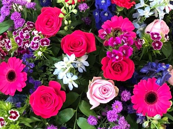 Vibrant cerise pinks, deep purple and a hint of blue flowers adorn this beautiful tribute.