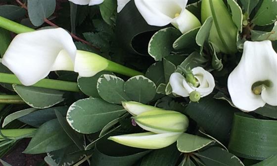 A stunning spray of calla lilies, oriental lilies combined with a mix of foliage.