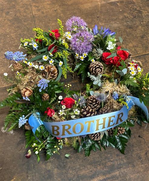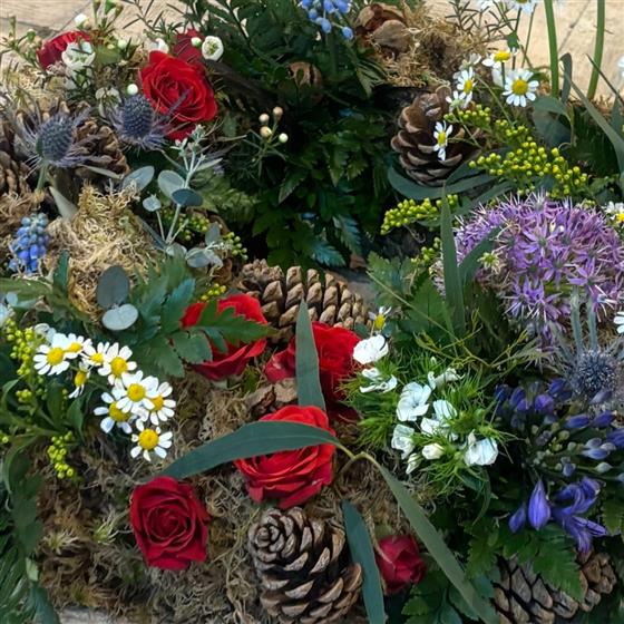 A natural style of beautiful blooms recreate this elegant woodland wreath.